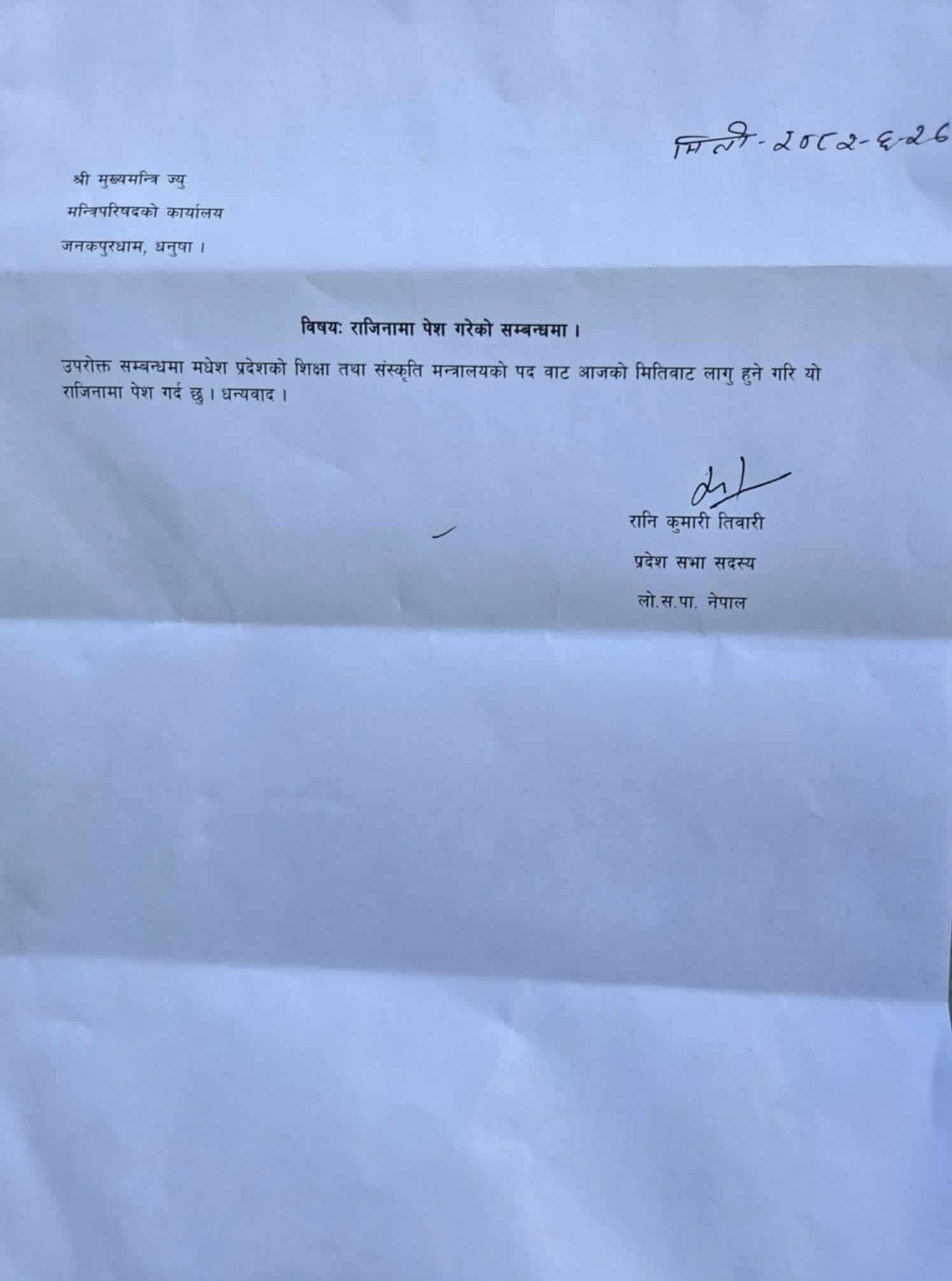 मधेस प्रदेशमा शिक्षा तथा संस्कृति मन्त्री रानीकुमारी तिवारीले आफ्नो पदबाट राजीनामा दिएकी छन् ।
