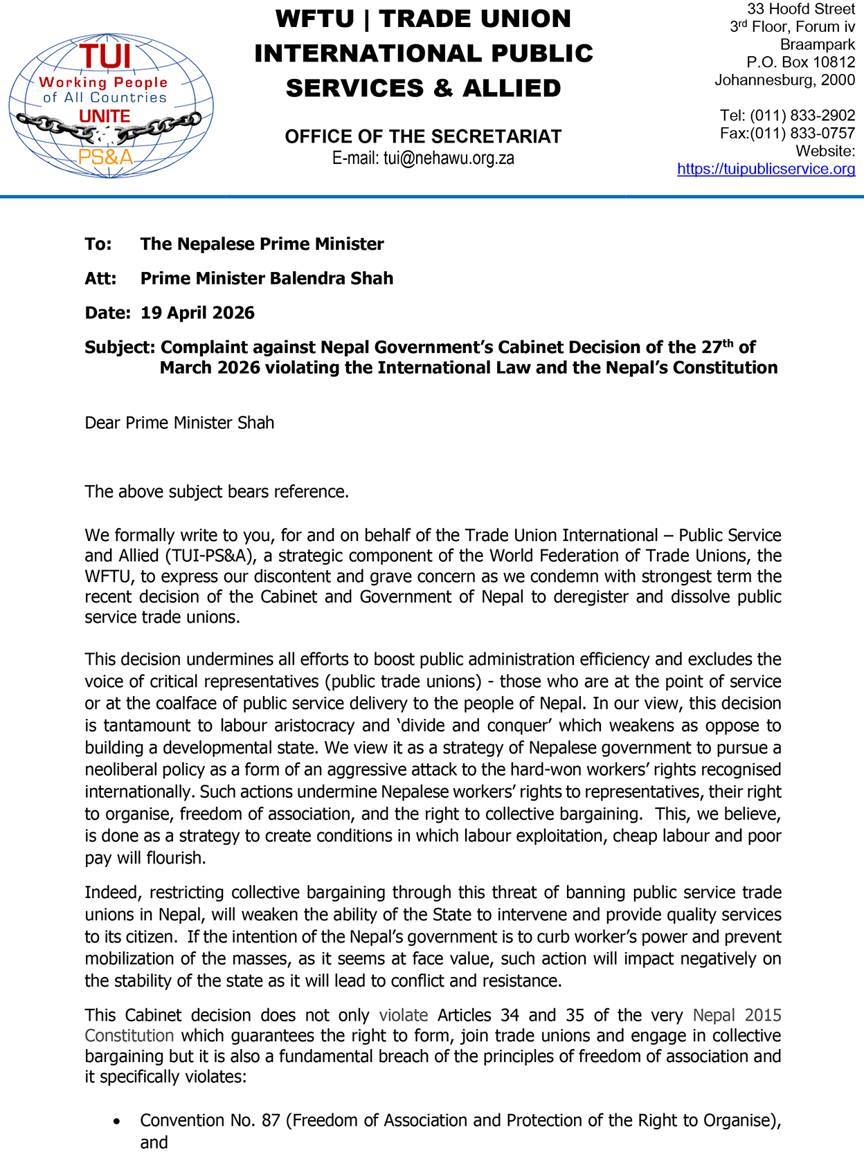 संगठनले वैशाख ६ गते (१९ अप्रिल २०२६) प्रधानमन्त्रीलाई सम्बोधन गर्दै पठाएको पत्रमा ट्रेड युनियन खारेज गर्ने कुनै पनि निर्णय अन्तर्राष्ट्रिय कानुन र नेपालको संविधानको मर्मविपरीत हुने उल्लेख गरिएको छ। महासचिव जोला सापेथा द्वारा हस्ताक्षरित पत्रमा कामदारहरूको संगठन बनाउने, संगठित हुने तथा सामूहिक सौदाबाजी गर्ने अधिकारमाथि प्रत्यक्ष असर पर्ने चेतावनी दिइएको छ।