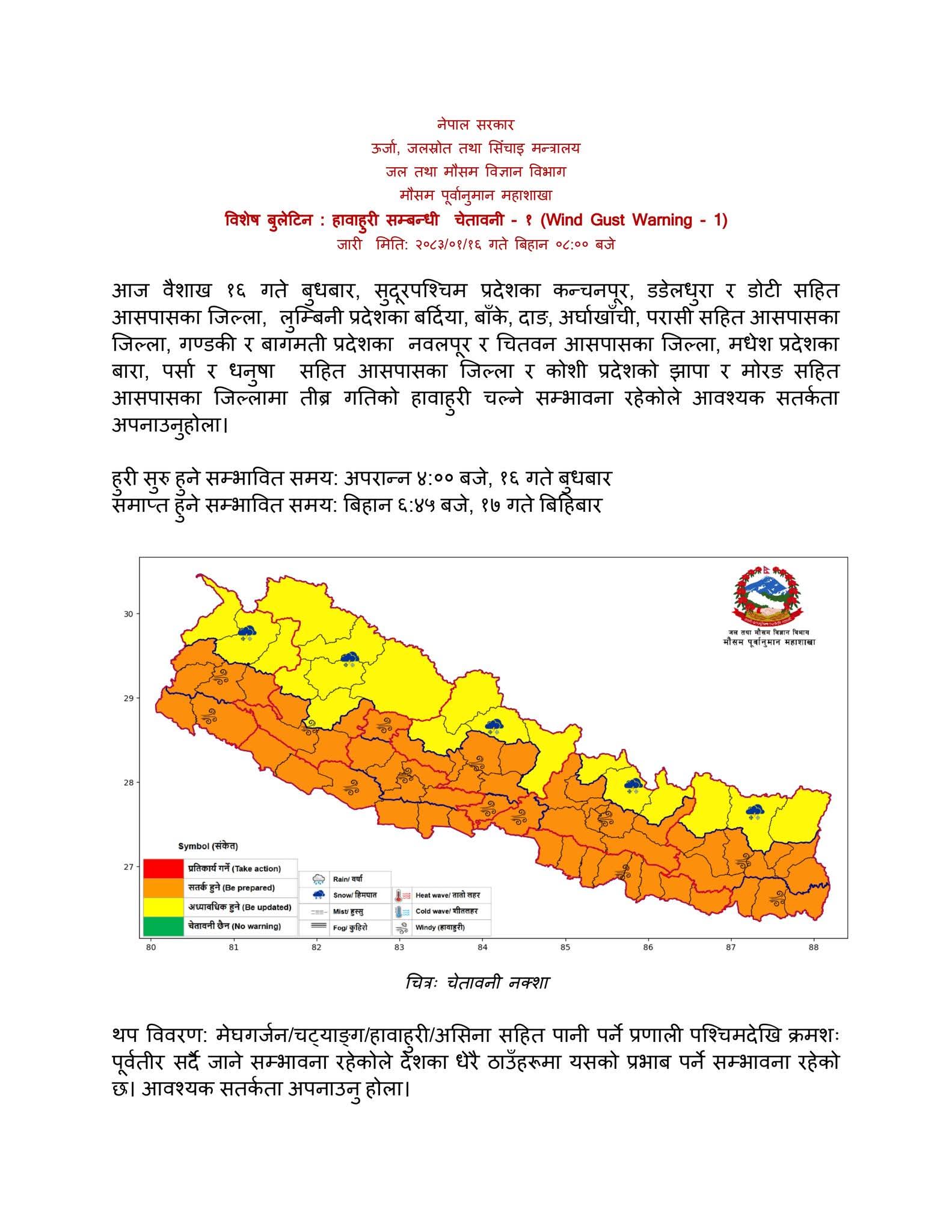 बुलेटिनअनुसार हावाहुरी आज अपराह्न ४:०० बजेदेखि सुरु भई भोलि बिहान ६:४५ बजेसम्म कायम रहने सम्भावना रहेको छ।
